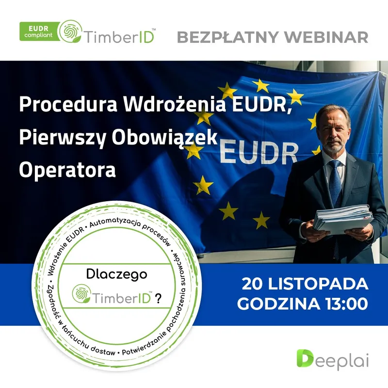 Deeplai P.S.A., partner techniczny PEFC, zaprasza 20 listopada o godzinie 13:00 na bezpłatne webinarium w pod tytułem: Procedura Wdrożenia EUDR, Pierwszy Obowiązek Operatora.